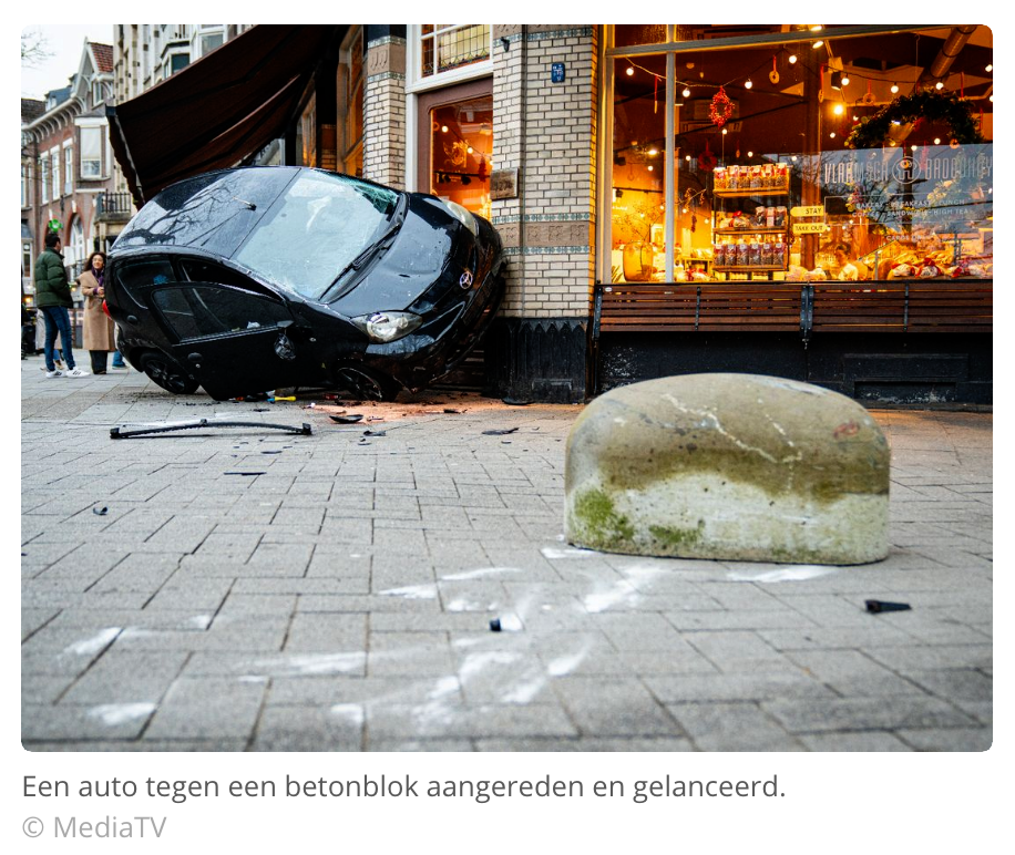 据rijnmond.nl报道,周日早晨,鹿特丹市中心Nieuwe Binnenweg发生一起意外事故。一辆汽车先撞上混凝土路障,随后被冲击力“弹飞”,侧翻后撞进一家面包店,最终在店铺门口停下。