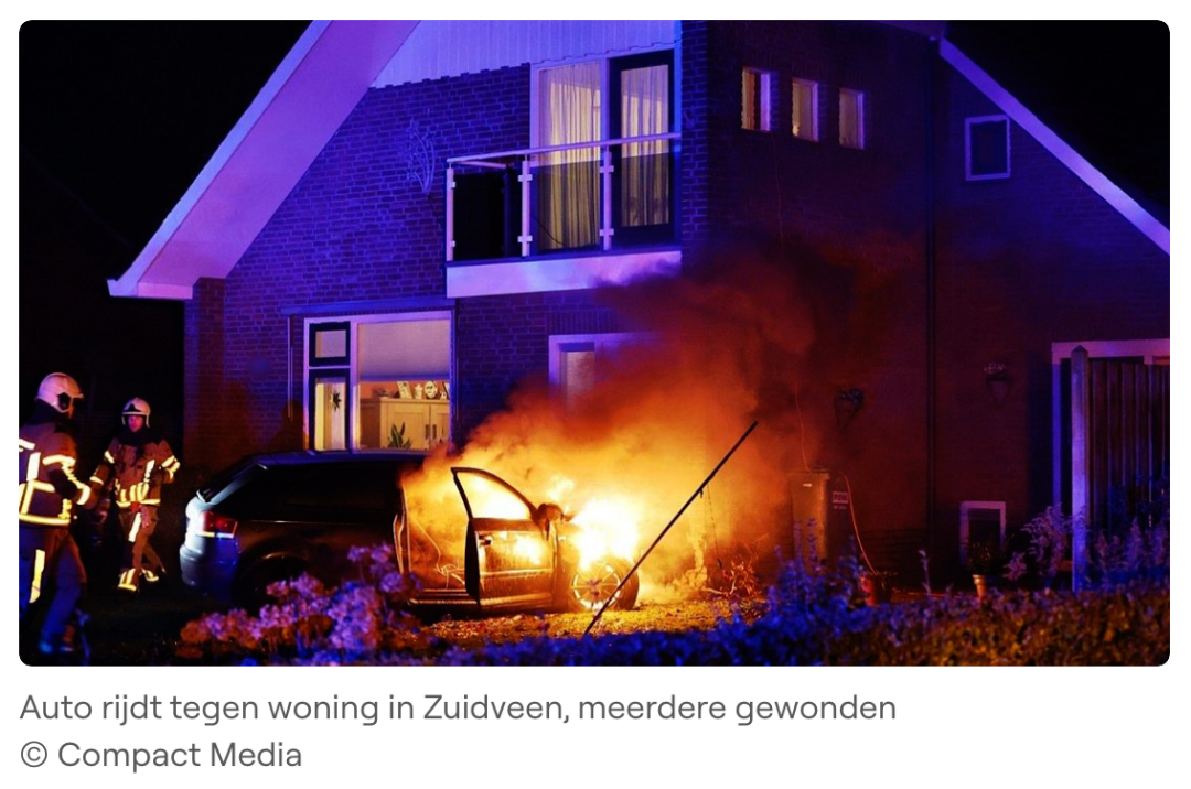 据nltimes.nl报道,同样在周六凌晨,德伦特省Zuidveen发生一起酒驾事故。一辆汽车冲入当地一处民宅后起火,所幸屋内无人受伤,但房屋结构受损严重,消防人员不得不对房屋进行支撑加固。